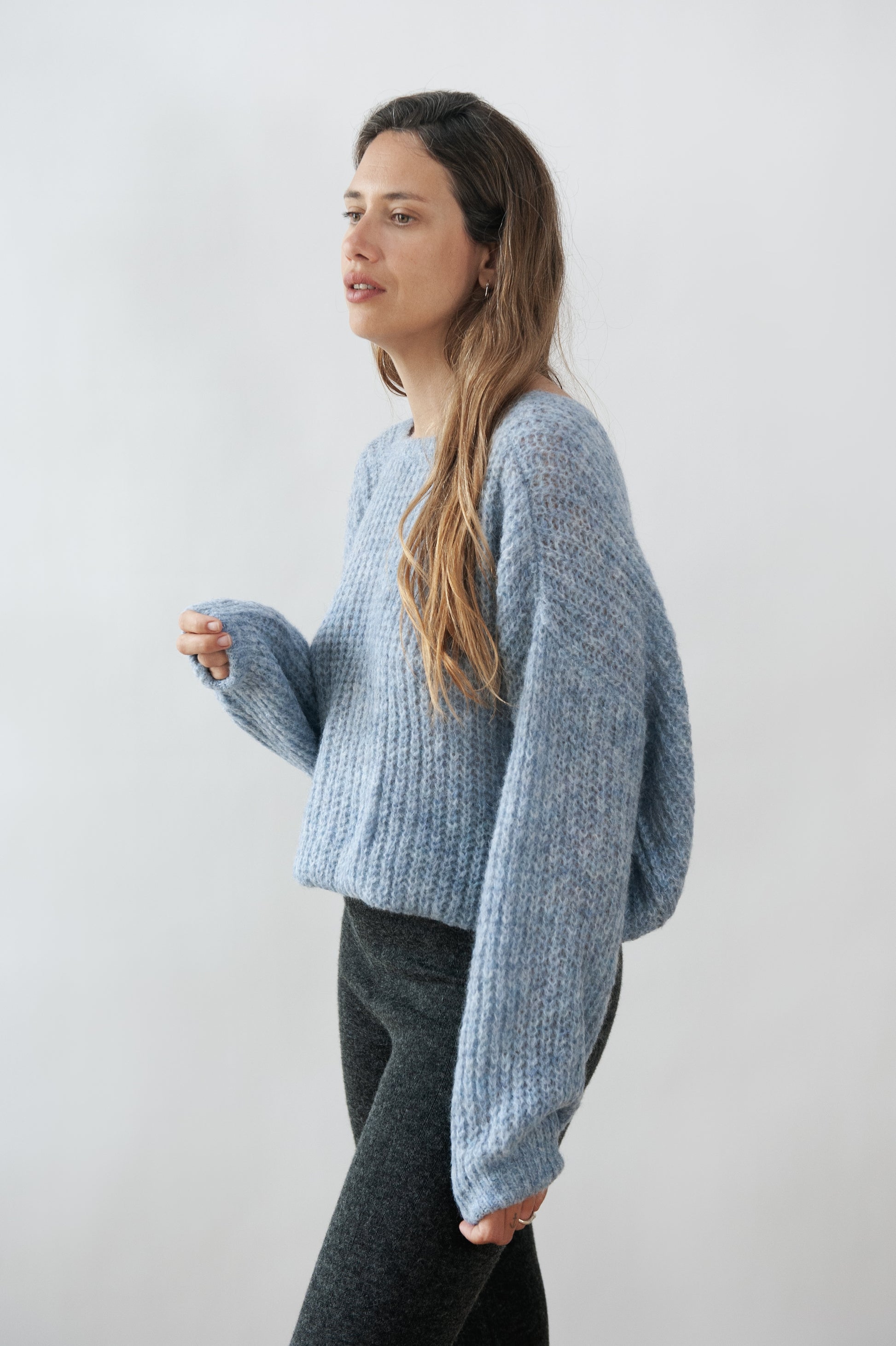 Das Material ist eine Mischung aus feinster Premium-Alpakawolle und einem geringen Anteil recycelter Synthetikfasern, die die Form halten und Pilling vorbeugen.